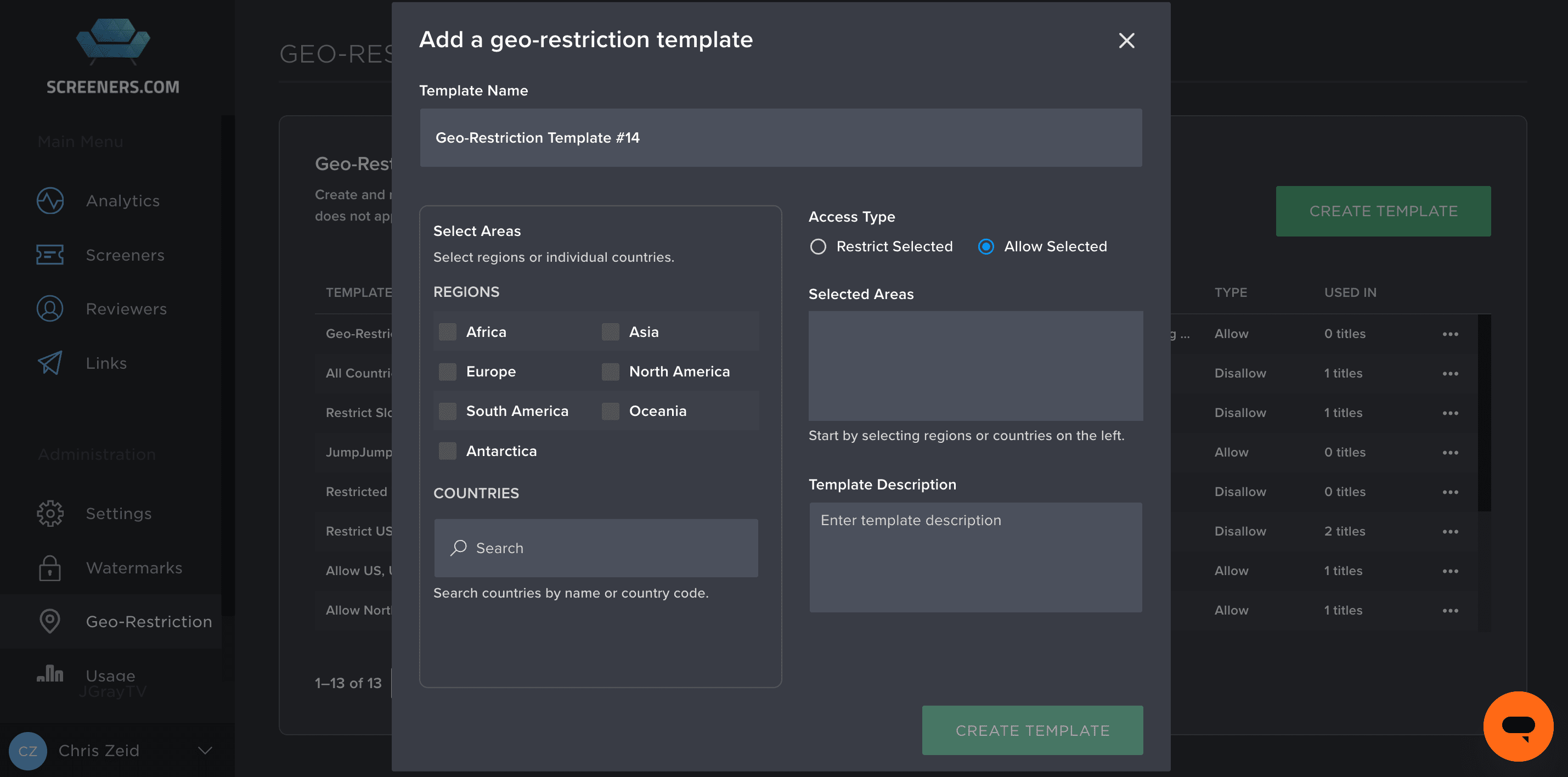 Select Create Template to begin the creation of your new Geo-Restriction template. Here you can add a Template Name and Description and select the areas for your Geo-Restriction. You can also select whether this template should restrict or allow access to selected areas. For Example: You may want a specific location to be the only location that has access to the screener (allow location) or you may want to designate specific areas that are restricted from accessing the screener (restrict selected).